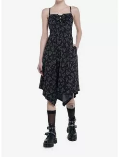 This maxi dress brings a little bit of a twist with its shark bite hem and hook-and-eye detail going down the length of the dress. It has adjustable straps.