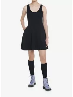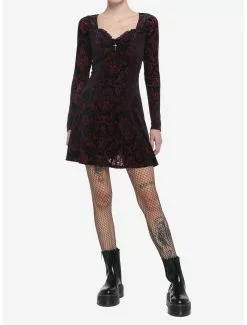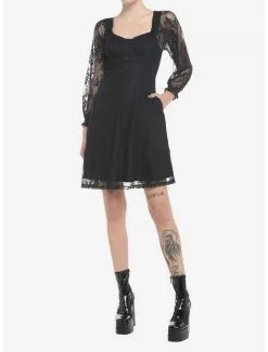 Need a witchy basic in your wardrobe? This hooded dress has lace trim on the sleeves and bottom hem, bell sleeves, and a lace-up neckline. There are also pockets.
