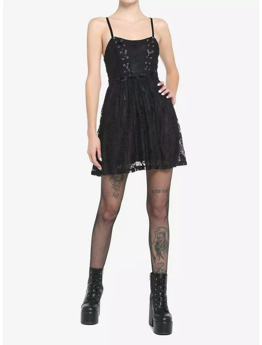 For the days you need to dress up, but still want to keep it edgy! This black dress has a lace overlay with a skull and rose pattern and features lace-up detailing at the bust. Comes with adjustable straps, side seam pockets and a side zipper closure.