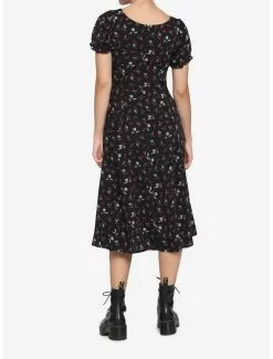 This dress is all business in the front and death’s-head moth party in the back! The back features a cream embroidered lace pattern with the death’s-head moth, moon phases and roses. Featuring an elasticated gathered waist.