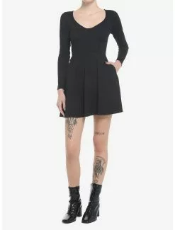 COSMICAURA Black Corset Seam Long-Sleeve Dress