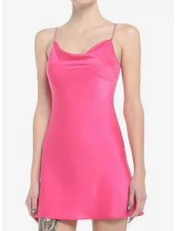 Going out? Have we got a dress for you! This hot pink mini has a cowl neckline and sparkling, jeweled straps. Fully lined.
