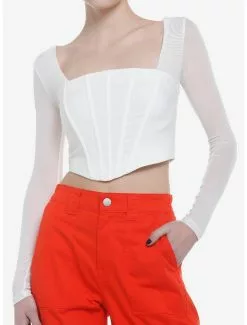 Sweeten up your wardrobe with a romantic corset top! This long-sleeve features a structured bust with a slightly pointed hem, plus mesh long-sleeves and a square neckline.