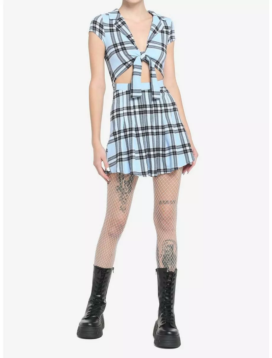 Spice up your plaid look in this cute lil’ dress! This light blue plaid dress features a front tie closure, revealing flirty cutout detailing at the tummy. Complete with collar and an elasticated waistband.