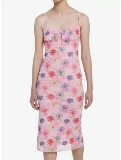 Look as fresh as a daisy in this pink midi dress, featuring a mesh layer on top with an allover floral and tie-dye design. Comes with adjustable straps and bow detailing at the bust.