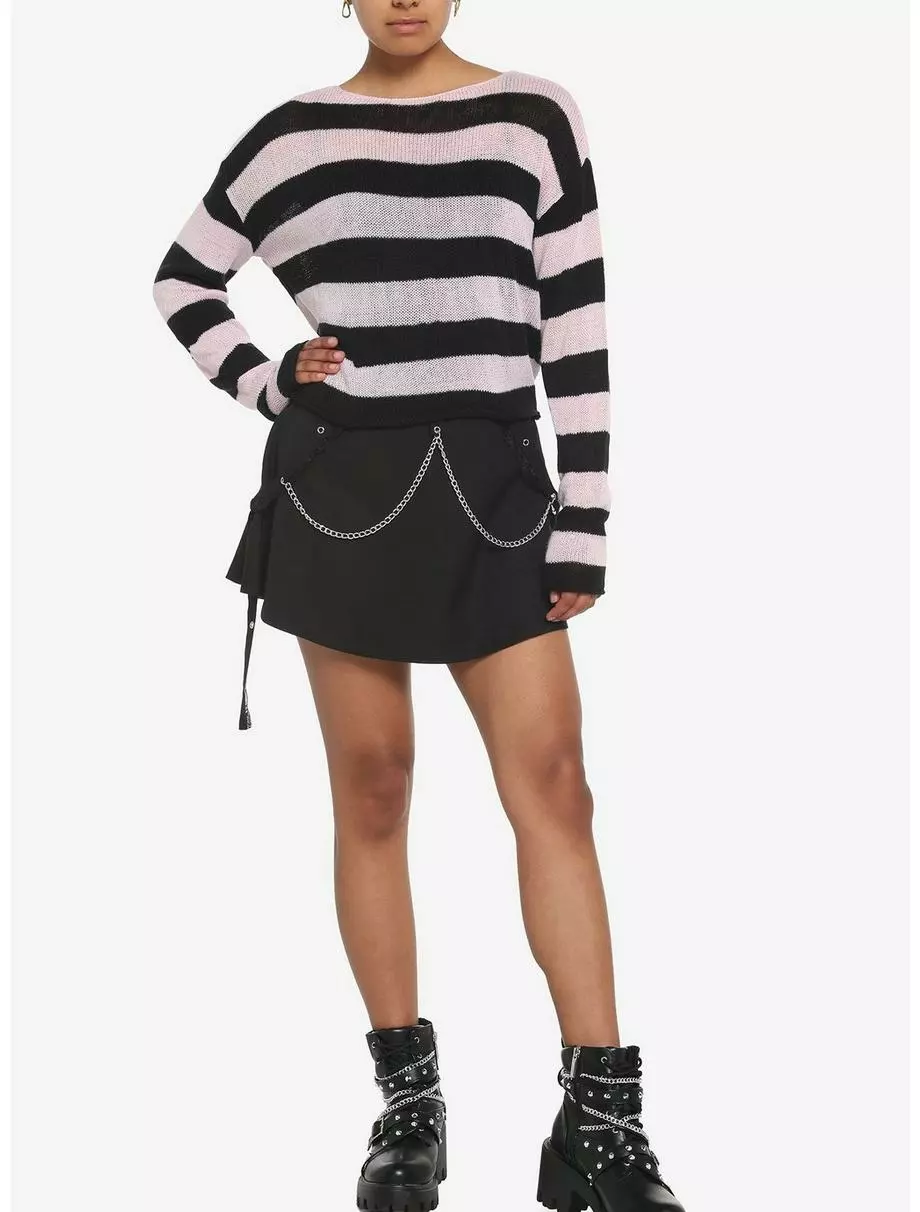 Meet your new favorite layering piece! This lightweight sweater features pink and black horizontal stripes and a cropped length.