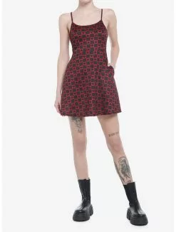 It’s a split decision! This skater dress features a split solid black and white and black skull print design with black lace trim. Adjustable straps.