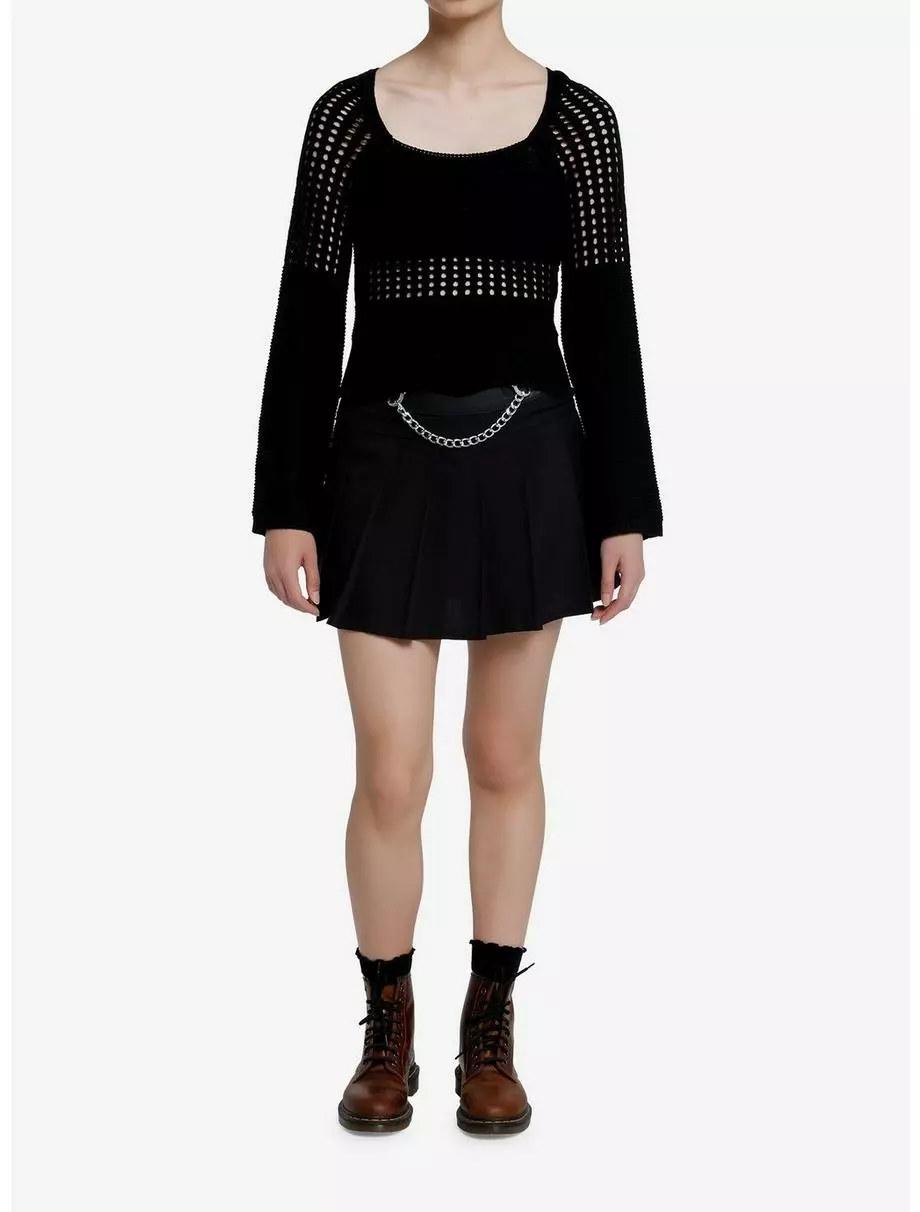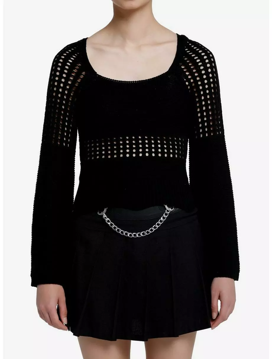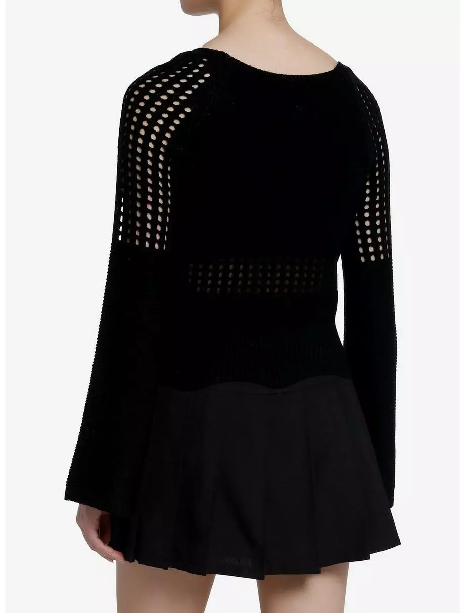 This sweater is for all the baddies that want to keep it cozy. It has a cropped fit and features crochet paneling throughout, plus bell sleeves.