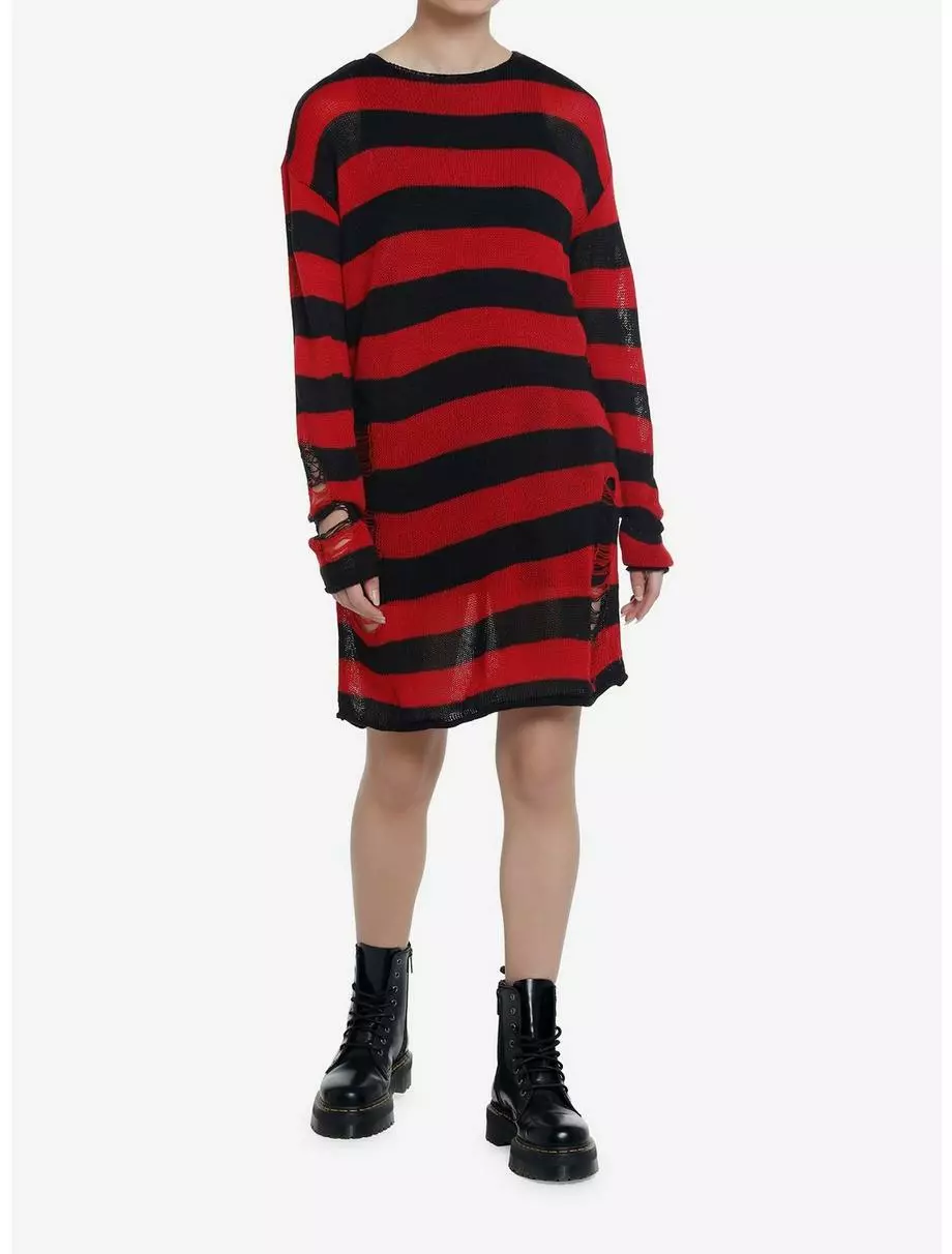 Keep it punk and cozy in this knitted sweater dress! It is slightly see through and features a classic black and red stripe design, plus distressed detailing on the sleeves and sides.