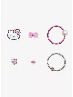 Hello Kitty is here to give an extra sweet touch to your look! This set features pink gem, bow and Hello Kitty studs, plus hoops with gem and faux pearl accents.
