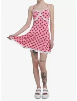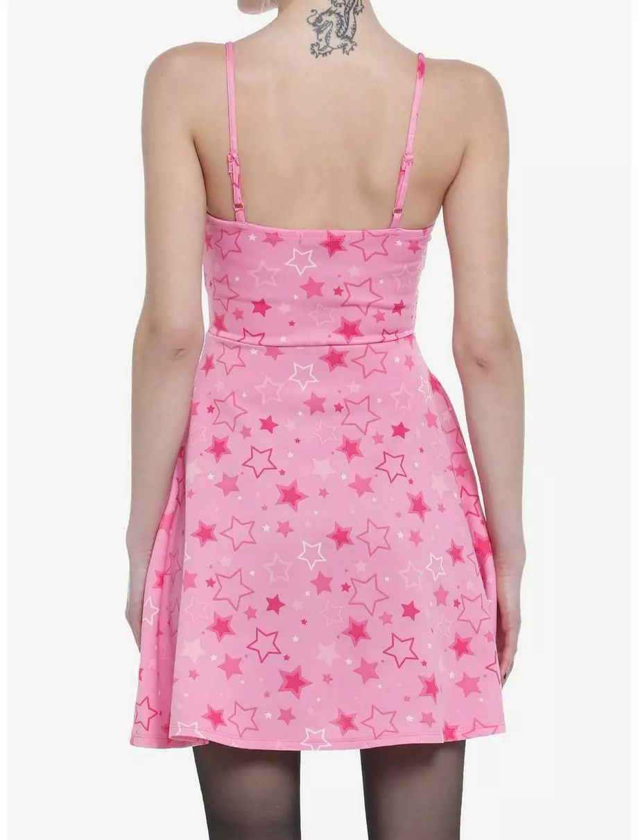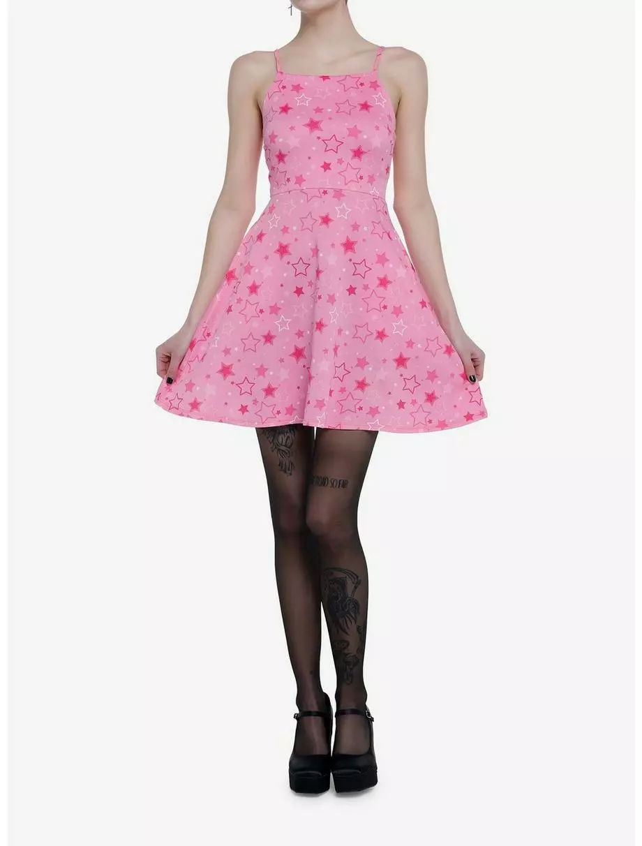 Take your next ‘fit to stellar levels with this strappy tank dress featuring an allover print of hot pink stars . It has pockets and adjustable straps.